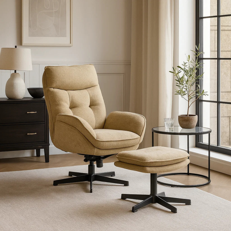 Кресло с табуретка ANDREA съчетава мекота, елегантност и удобство в едно. Моделът е изцяло тапициран с приятна на допир дамаска и впечатлява с изчистен дизайн и висока облегалка, която прегръща тялото. Люлеещата функция и включената табуретка правят почивката още по-приятна. Металната основа осигурява стабилност и издръжливост до 130 кг. Пълна информация за размерите и характеристиките на модела ще намерите в таблицата в таб/поле „Техническа информация“