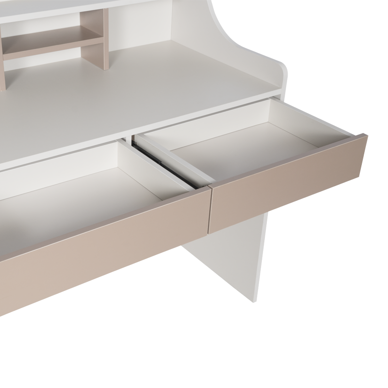 Бюро CORON предлага практично и елегантно решение за всяка детска или тийн стая или домашен офис. Две чекмеджета и горен рафт с разделения създават удобна организация на учебни и творчески материали. Пълна информация за размерите и характеристиките на модела ще намерите в таблицата в таб/поле 'Техническа информация'.