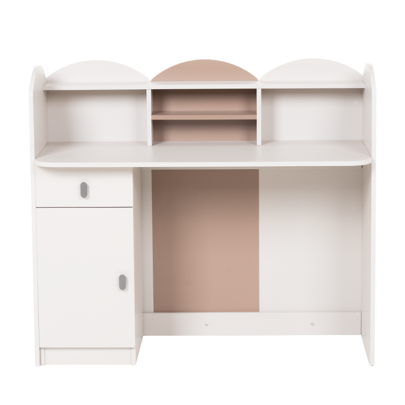 Бюро Pasig впечатлява с оригинален и заоблен дизайн, съчетаващ функционалност и нежна естетика, подходяща за детска или тийнейджърска стая. Множеството ниши и рафтове предлагат организирано пространство за книги, аксесоари или декоративни елементи. Шкафчето и чекмеджето с плавно затваряне улесняват подреждането на учебни пособия и лични вещи. Задната цветна панелна част придава завършен и хармоничен вид. Пълна информация за размерите и характеристиките на модела ще намерите в таблицата в таб/поле 'Техническа информация'.