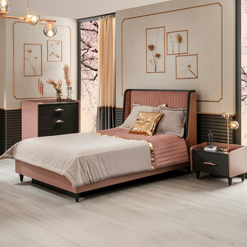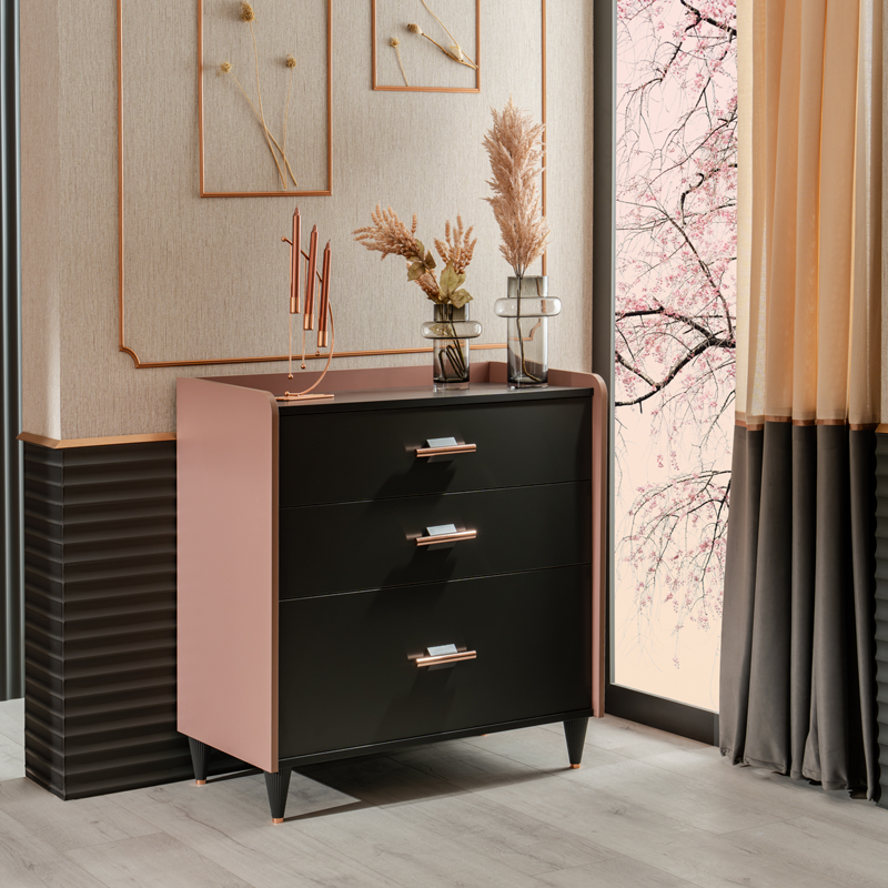 Детски скрин за дрехи VALENCIA впечатлява с изискан дизайн и практична функционалност. Моделът разполага с три чекмеджета, като долното е по-дълбоко и осигурява повече място за по-обемни дрехи или аксесоари. Чекмеджетата са оборудвани с механизъм с плавно затваряне, който осигурява тиха и безопасна употреба. Краката с височина 12 см, изработени от ABS материал с rose gold детайли, позволяват лесно почистване с робот прахосмукачка. Конструкцията е от висококачествен 18 mm материал, който гарантира стабилност, дълготрайност и безопасност при ежедневна употреба. Пълна информация за размерите и характеристиките на модела ще намерите в таблицата в таб/поле 'Техническа информация'.