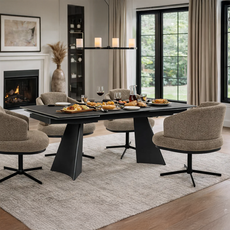 Разтегателна трапезна маса CARORA впечатлява с изчистен модерен дизайн и стабилна конструкция. Плотът е изработен от керамика с дебелина 12 мм, която се отличава с висока устойчивост на износване и лесна поддръжка. Праховобоядисаната метална основа осигурява надеждна стабилност и придава елегантен индустриален акцент. Благодарение на функцията за разтягане, масата се увеличава от 180 до 280 см, което я прави идеална за големи семейни събирания или посрещане на гости.