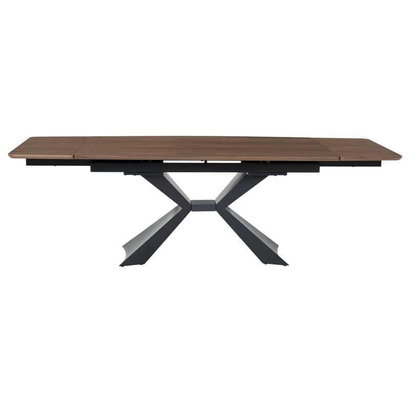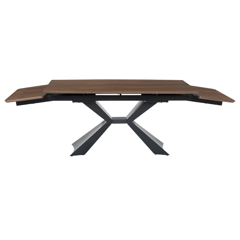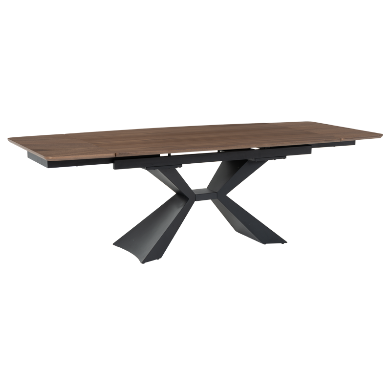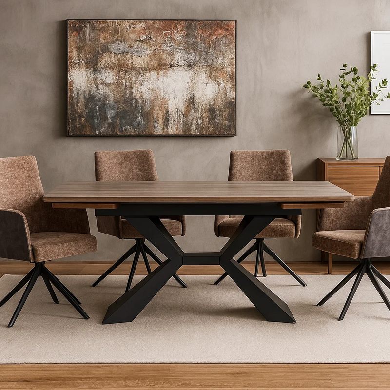 Разтегателна трапезна маса TIGRE впечатлява с балансирано съчетание между топъл дървесен уют и модерен индустриален стил. Плотът е изработен от МДФ с естествен фурнир, с дебелина 25 мм, отличаващ се със здрава и устойчива структура, а праховобоядисаната метална основа осигурява стабилност и визуален контраст.Благодарение на удобния механизъм за разтягане, масата лесно се адаптира към броя на гостите, като съчетава елегантен външен вид с практична функционалност. Топлият орехов цвят добавя изтънченост и хармония към всяко помещение. Пълна информация за размерите и характеристиките на модела ще намерите в таблицата в таб/поле 'Техническа информация'.