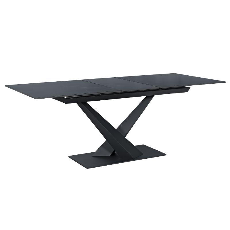 Разтегателна трапезна маса TINACO впечатлява с елегантна визия и стабилна конструкция. Плотът е изработен от керамика с дебелина 12 мм, която се отличава с устойчивост на надраскване и лесна поддръжка. Праховобоядисаната метална основа с кръстосан дизайн придава динамика и модерен акцент на модела.Благодарение на удобния механизъм за разтягане, масата се увеличава от 160 до 200 см, осигурявайки допълнително пространство при нужда.