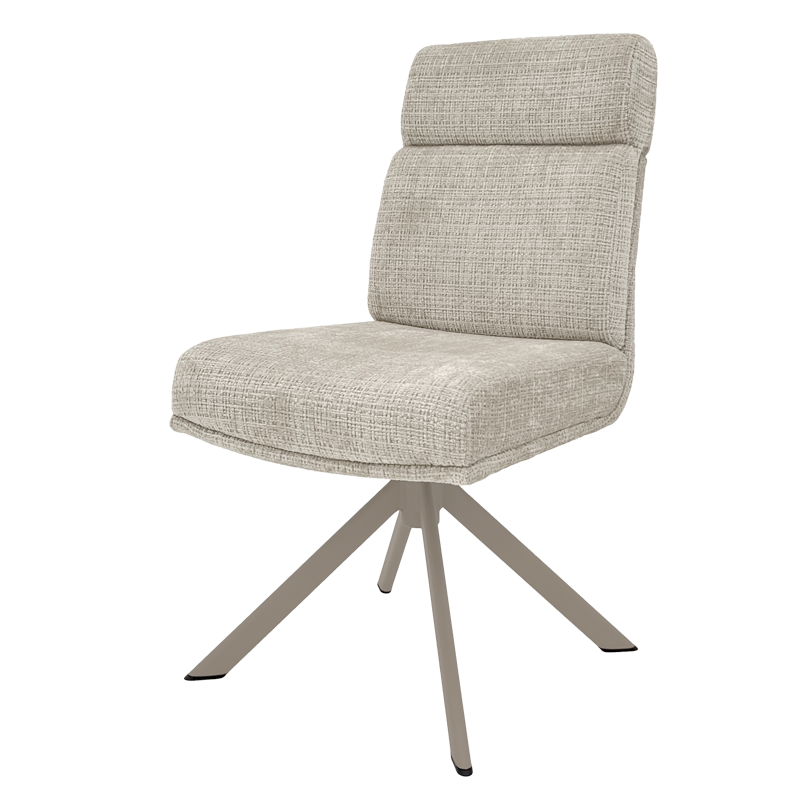 Трапезен стол TURI впечатлява с модерен силует и изключително комфортна седалка от мека дамаска с покет пружини. Основата от праховобоядисан метал в елегантен крем-перла цвят придава лек и изискан характер. Моделът разполага с 360° въртене, автоматично връщане в изходна позиция и дискретна люлееща функция, осигуряващи допълнителна свобода и удобство при сядане. Подходящ избор за съвременни трапезни кътове и стилно модерни интериори. Пълна информация за размерите и характеристиките на модела ще намерите в таблицата в таб/поле "Техническа информация".