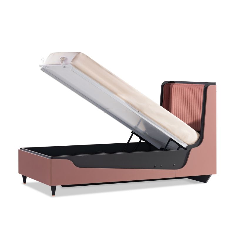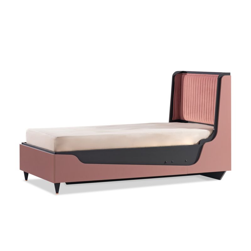 Детското легло VALENCIA 120 х 200 см съчетава луксозен дизайн с висока функционалност, благодарение на вградената база с голямо отделение за съхранение, което оптимизира пространството в стаята. Леглото е оборудвано с амортисьори със защитно заключване, които гарантират безопасно и лесно повдигане и спускане на механизма. Таблата е тапицирана с мек велурен текстил и елегантен капитониран дизайн, а заоблените ъгли и стилните крака с метални акценти придават завършен и изискан вид. Конструкцията от 18 мм ПДЧ с E1 сертификат и капацитет на натоварване до 130 кг осигурява здравина и дълготрайна употреба. Пълна информация за размерите и характеристиките на модела ще намерите в таблицата в таб/поле "Техническа информация".