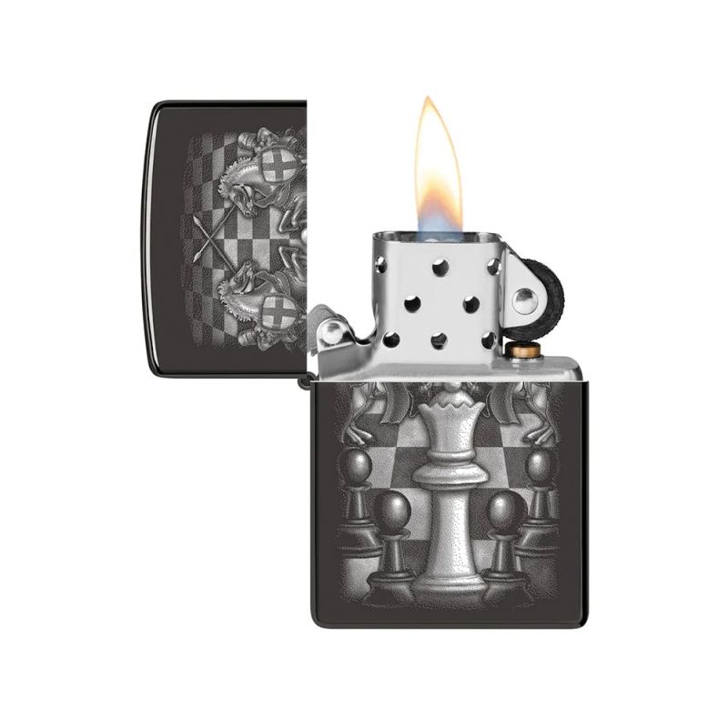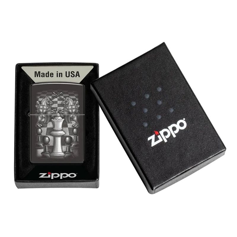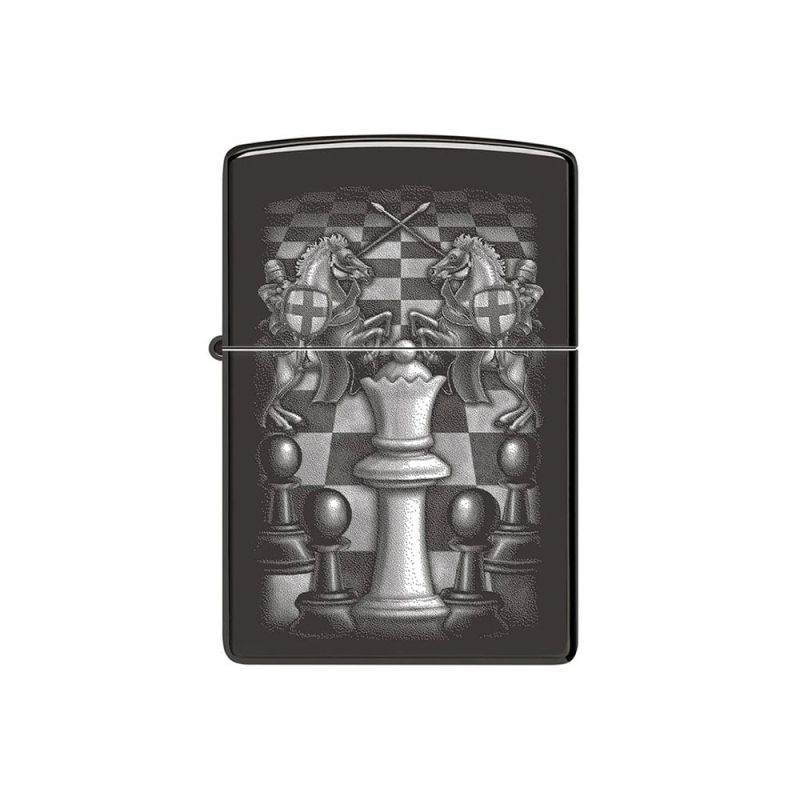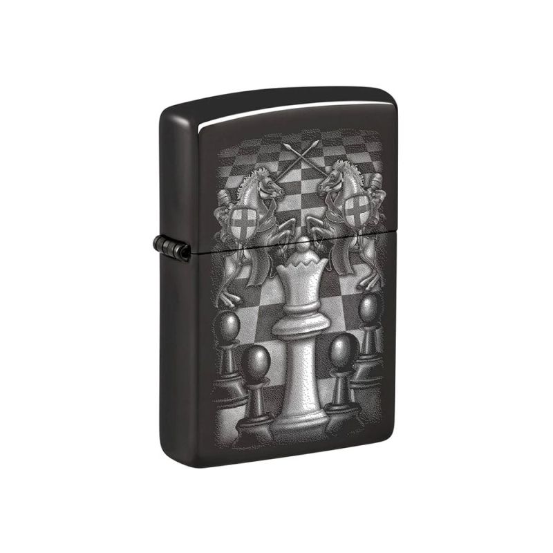Заобиколена от своите доверени рицари, кралицата доминира шахматната дъска в този величествен дизайн с цветно изображение, представен върху класическа запалка Zippo с покритие High Polish Black. Сцената излъчва сила, стратегия и елегантност, превръщайки модела в впечатляващ визуален акцент.