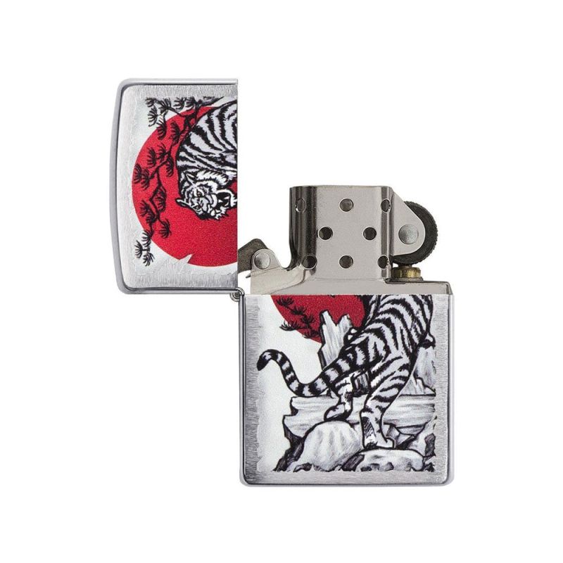 Този впечатляващ дизайн на тигър е реализиран чрез техниката за цветно изображение и се отличава със силно драматично излъчване. Художниците на Zippo използват тъмни сенки и фино изведени линии, за да пресъздадат реалистичен тигър, който се изкачва към кървава луна, създавайки динамична и запомняща се сцена.