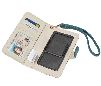 Еко кожа Затваряне с капак с магнит Плоча с гравирано лого Обков в златист тон Регулируем вътрешен плъзгащ се държач за телефон ( един размер, пасва за повечето телефони) Два държача за карти, един джоб за банкноти Включва подвижна каишка за китка ( 20,3 cm дилжина) Размери: 8,9 cm дължина x 2,5 cm ширина x 16,5 cm височина