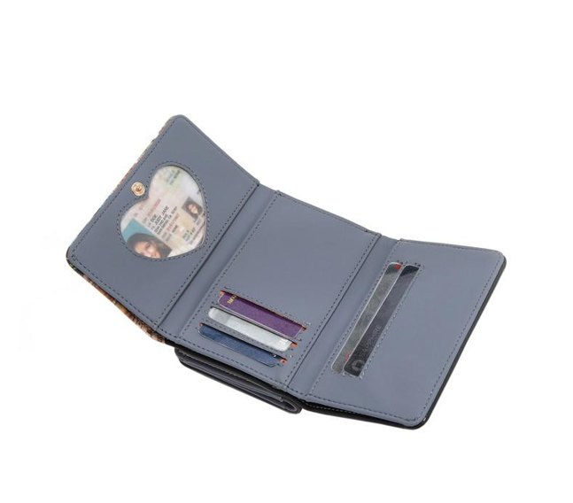 Външност от еко кожа. Преден капак с копче, който се отваря до тройно вътрешно пространство с 1 прозорец за лична карта във формата на сърце, 2 отделения за банкноти/пари в брой, 5 отделения за карти. Централен джоб за монети с копче. Заден портфейл с два капака и копче, който се отваря до 1 прозорец за лична карта, 2 отделения за банкноти/пари в брой, 4 отделения за карти. Вътрешна подплата от полиестер с принт. Аксесоари в златист цвят. Размер: 12,7 см (Д) x 3,8 см (Ш) x 8,9 см (В). Опаковано в кутия.