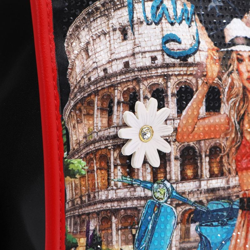 Изработена от висококачествен еко кожен материал с прозрачни кристални камъчета и декорации със звезди и цветя отпред Три основни отделения, включително преден и заден цип, както и средно отделение с магнитни закопчалки С ексклузивна подплата от полиестер с принт, заден джоб с цип и удобен преден джоб Включва регулируема и подвижна каишка за носене през тялото Размери: 23.5 x 19 x 6 cm