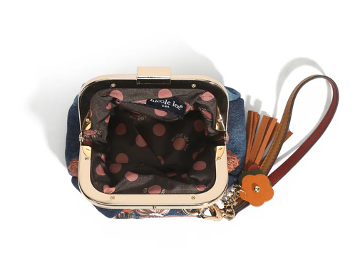 Израбоетна от висококачествена еко кожа Метална закопчалка с ключалка D-пръстен за закрепване на каишката за китката Табелка с лого Вътрешна подплата с първокласен принт Nicole Lee Включва сваляща се каишка за китка (с дължина 16,5 см) от еко кожа и ресни Размери: 15,2 см дължина х 7,6 см ширина х 12,7 см височина