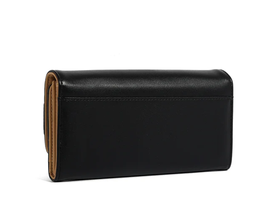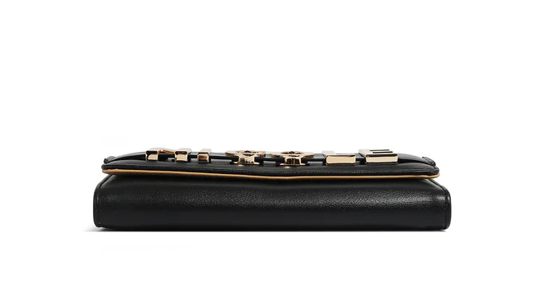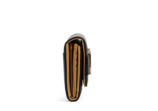 Външна част от еко кожа. Клапан с копче за затваряне. Каишка с метално лого и дизайн на катарама. Златни метални детайли. Вътрешна подплата с премиум полиестерен принт. Триъгълно разпределение на вътрешността. 11 отделения за карти, 1 прозорец за идентификационна карта, 2 отделения за пари. Централен цип-джоб. ANTI THEFT RFID (радиочестотна идентификация) блокираща технология: Борбата с кражбата на самоличност започва от вашата чанта. RFID технологията предотвратява преминаването на сигналите от четящите устройства през вашата чанта и защитава съдържанието. Размери: 17 x 10 x 4 cm