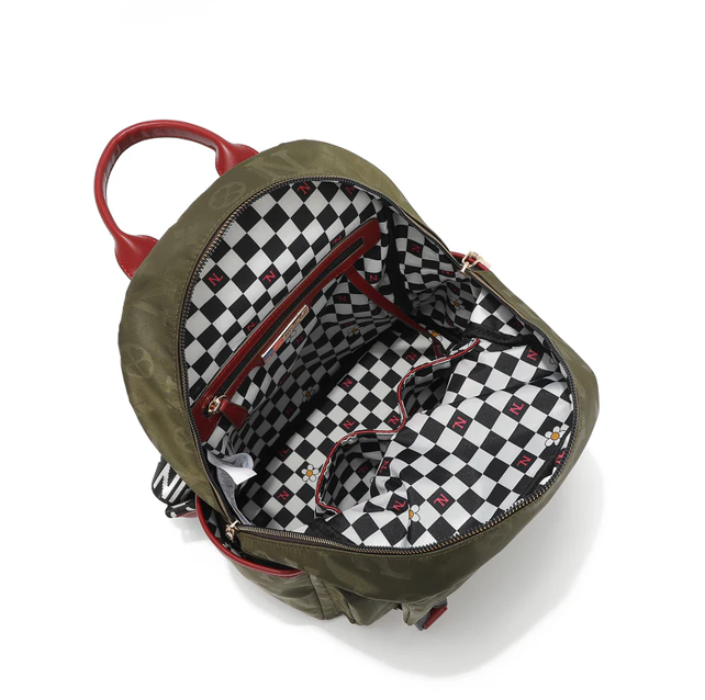 Външна част от лек полиестер с детайли от еко кожа Горна дръжка (височина 7,5 см) Регулируеми и двойни презрамки за рамо Горен цип с двупосочно отваряне Преден джоб с клапа и цип 2 предни джоба с клапа и закопчаване с бутон Странични джобове Метални елементи в златист тон Лога от метални букви и гравирани малки ципове Вътрешна подплата от полиестер Заден вътрешен джоб с цип и лента за ключове 2 вътрешни предни джоба за телефон и портфейл Размер: 27 x 35 x 14.5 cm