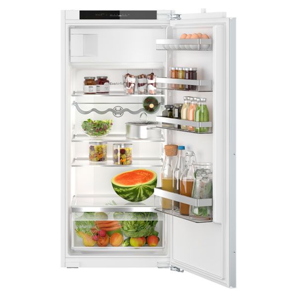 Просторният хладилник за вграждане с фризерно отделение е проектиран да осигури оптимални условия за съхранение на храната, тишина в дома и дълготрайна надеждност. Съчетава интелигентни технологии, практичен вътрешен дизайн и високо качество на изработка, за да отговори на нуждите на съвременното домакинство.Голямото чекмедже MultiBox XXL предлага изобилно пространство за плодове и зеленчуци – идеално за съхранение на салати, свежи продукти или дори обемни храни като диня. Системата Eco Airflow осигурява равномерна циркулация на въздуха и постоянна температура в цялото хладилно отделение, което запазва храната свежа по-дълго и намалява разхищението.Функцията Super Cooling понижава температурата за кратко време, когато поставите нови продукти, като ги охлажда бързо и едновременно с това предпазва вече съхраняваните храни. След определен период функцията автоматично се изключва, за да се избегне излишна консумация на енергия.Вътрешното LED осветление осигурява ярка и равномерна видимост във всяка зона на хладилника, като същевременно е енергийно ефективно и дълготрайно. Здравите рафтове от безопасно стъкло позволяват съхранение дори на тежки съдове и са лесни за почистване.Хладилникът работи изключително тихо – с клас на шум B (30–35 dB), което го прави подходящ за отворени пространства и гарантира спокойна домашна среда. Звуковата аларма за отворена врата предпазва от загуба на студ и енергия, като ви уведомява навреме, ако вратата не е затворена правилно.Произведен в Германия, този хладилник отговаря на високи стандарти за качество и преминава през задълбочени тестове за дълготрайна и надеждна употреба – практично и сигурно решение за всяка модерна кухня.
