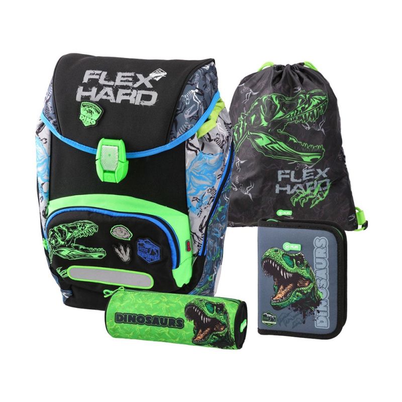 Практичен и функционален комплект, създаден да осигури комфорт, безопасност и отлична организация за училище и ежедневие. Комплектът включва всичко необходимо за ученика, съчетано в удобен и издръжлив дизайн: анатомична раница, торбичка за обувки (мешка), 1 празен несесер и 1 пълен несесер.Раницата е самостоятелно стояща, с тройно подсилени шевове и изработена от висококачествен полиестер 600D с водоустойчива тъкан, което гарантира дълготрайна употреба. За по-добра видимост и сигурност са добавени светлоотразителни предпазни ленти и предпазна катарама за колана.Комфортът при носене е осигурен от анатомично оформения гръб с меки подплънки и 360° вентилация, както и от регулируемите презрамки, които разпределят тежестта равномерно. Страничните джобове с голям капацитет предлагат допълнително пространство за бутилка или аксесоари, а щампованата подплата придава завършен и модерен вид. Надеждните ципове SBS с метални плъзгачи гарантират плавно и сигурно затваряне.