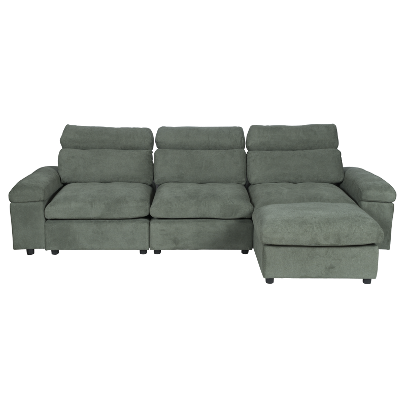 Ъгловият диван POKO впечатлява с изключителна функционалност и модерен дизайн, създаден за пълен комфорт. Изработен е от висококачествена дамаска, а в седалищната част, подлакътниците и долната част на възглавниците е добавен гъши пух, който осигурява невероятна мекота и усещане за лукс. Комфортът е подсилен и от пълнеж от пенополиуретан и покет пружини, разположени върху здрава конструкция от дърво и метал. И двата подлакътника разполагат с удобни отделения за съхранение – идеални за пакет чипс, книги, списания, таблет или лаптоп. Лежанката може да се позиционира вляво, в средата или вдясно, благодарение на модул тип табуретка, който се мести свободно. Под него е разположена практична мини ракла, осигуряваща допълнително място за съхранение.