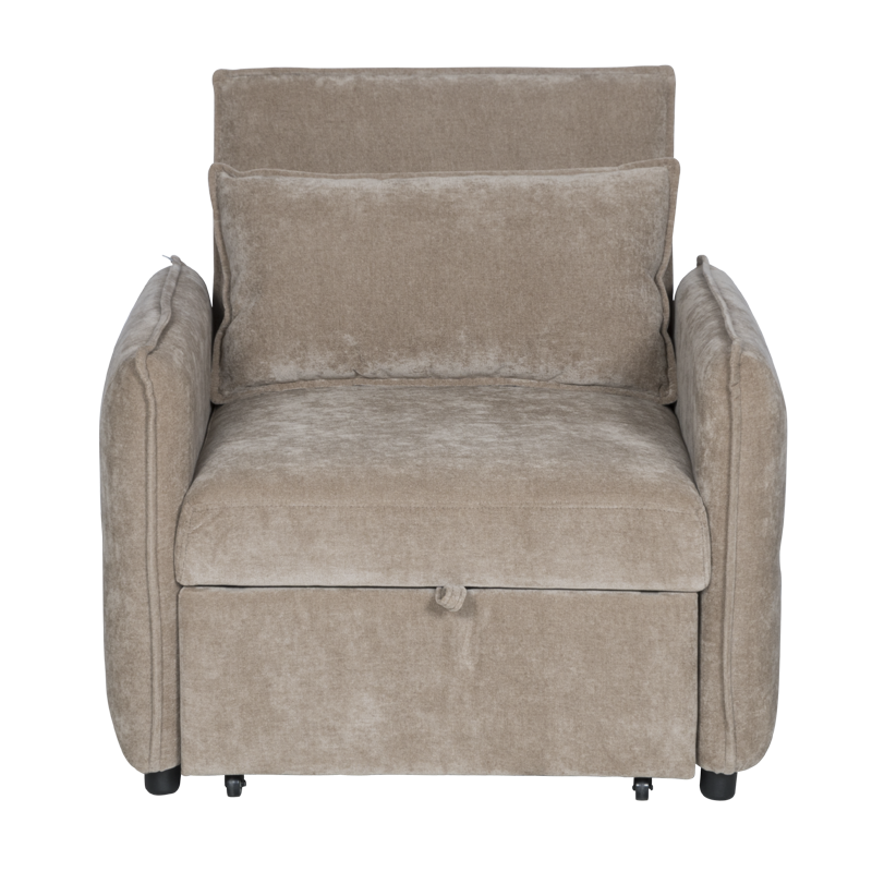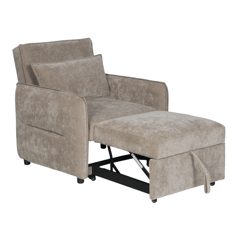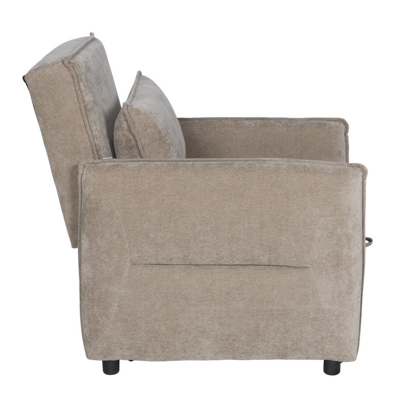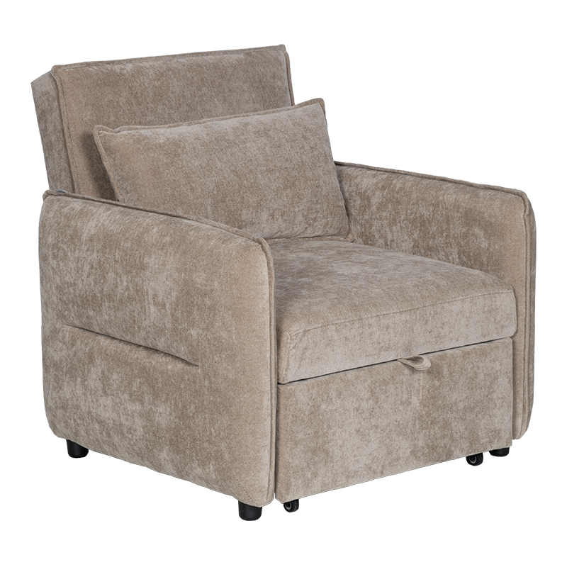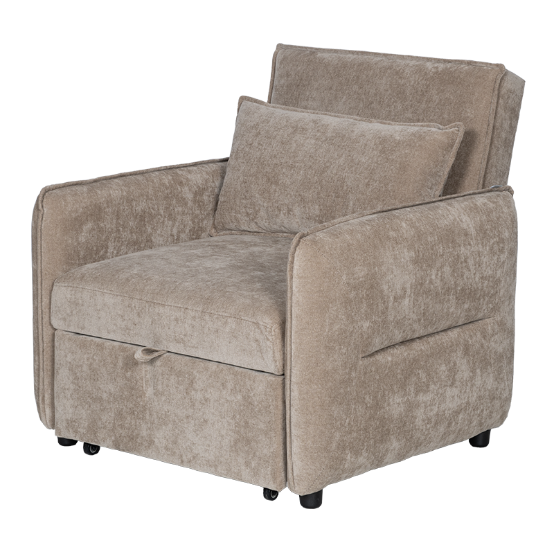 Разтегателен фотьойл AKETI е практично и стилно решение за малки пространства или за допълнение към диван. Моделът предлага функция сън, която се разгъва лесно и осигурява удобно място за отдих или пренощуване. Конструкцията е изработена от дърво и метал, а седалката комбинира полиуретан и покет пружини за комфорт и стабилна опора. Тапицерията от висококачествена дамаска създава усещане за мекота и уют, а краката от полипропилен гарантират устойчивост и лекота при преместване.