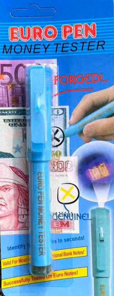 Универсален детектор за фалшиви банкноти, използващ специална химическа формула, откриваща подправени банкноти моментално. Достатъчно е да се отбележи с точка или друг знак върху банкнотата и да се проследи резултата. Ако цветът е жълт или прозрачен, банкнотата е автентична, ако премине в черно или кафяво, банкнотата е съмнителна. След няколко часа и в двата случая знака изчезва. UV светлинен източник в капачката за проверка на защитите на банкнотите видими само под UV светлина Включени батерии