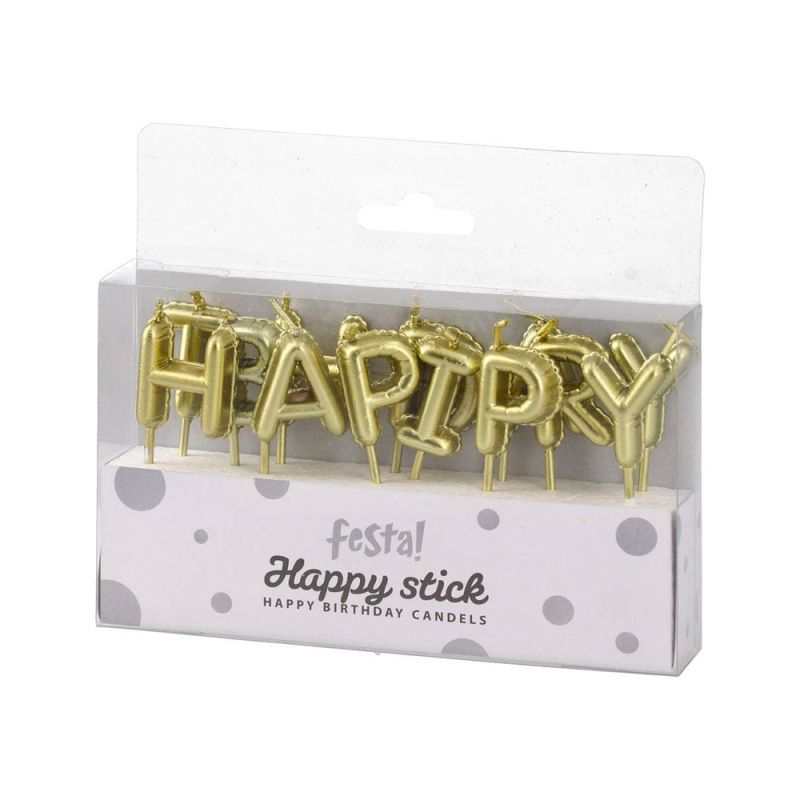 Свещи за торта Festa, Happy Birthday, златисти