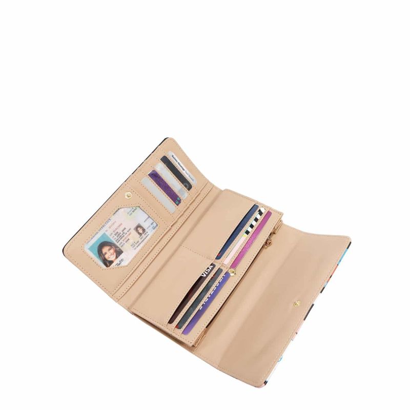 Външна част от еко кожа Закопчаване с капак с тик-так копче Златиста плочка с гравюра Премиум полиестерна подплата с щампа Тройно сгъваема вътрешна част
