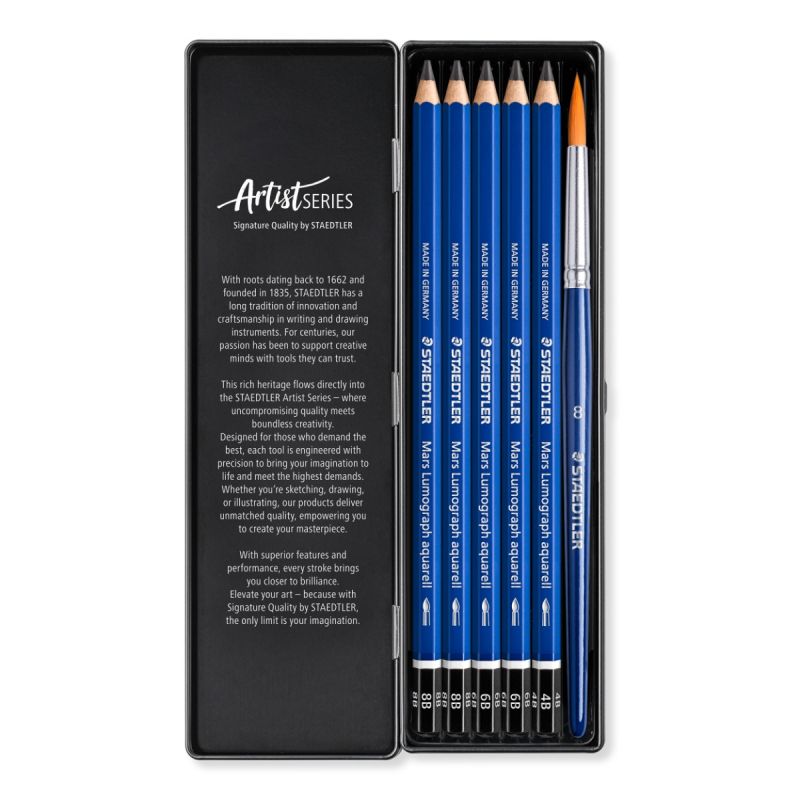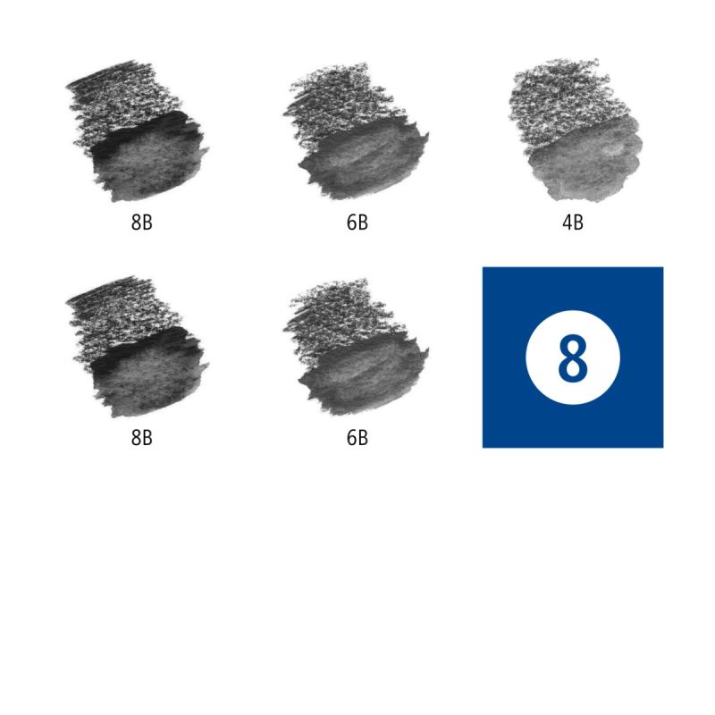 Комплектът включва 5 броя моливи (твърдост 4В, 6В и 8В) и кръгла четка №8Диаметър на графита 3.6 mmПроизведен в Германия от дървесина от сертифицирана гора