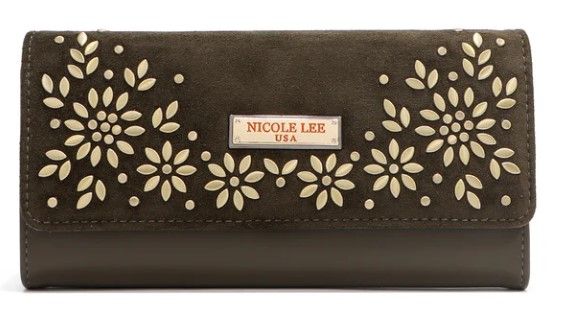 Външна част от еко велур и гладка кожа Тройно сгънат дизайн със закопчаване с тик-так за допълнителна сигурност Златиста плака с лого на Nicole Lee отпред Дизайн на предната част с инкрустирани флорални орнаменти Два джоба в горното отделение с централен джоб с цип Прозорче за лична карта и множество слотове за карти Висококачествена полиестерна подплата с щампа RFID технология за блокиране за защита на вашите данни и предотвратяване на неоторизирано четене на карти В кутия Размери: 19,05 см (Д) x 2,54 см (Ш) x 10,16 см (В)