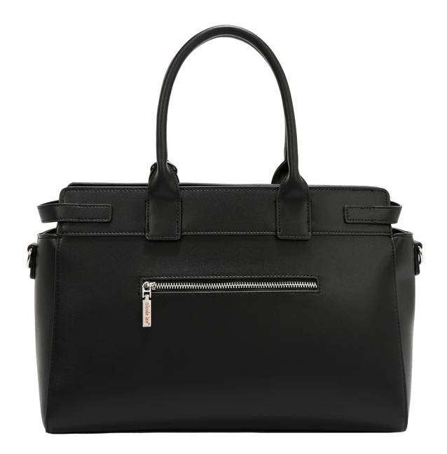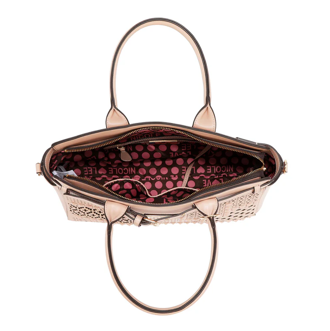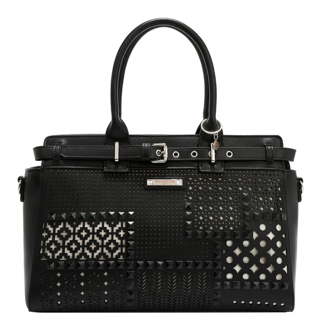 Външна част от висококачесвена еко кожа. Двойно заоблени горни дръжки, включва автентичен медальон Nicole Lee с кръгла форма . Затваряне с цип. Декориран отпред с мотиви. Декоративен колан отпред. Дъно с метални крачета за по-голяма защита. Заден джоб с цип. Метални детайли. Гравирана плоча с лого. Ципове с гравирано лого Странични D-пръстени. Подплата от полиестер. Вътрешен заден джоб с цип, плоча с лого и каишка за ключове. Два вътрешни джоба за смартфон и портфейл. Регулируема и премахваща се презрамка с гравирано лого. Размери: 41 x 25 x 15 cm