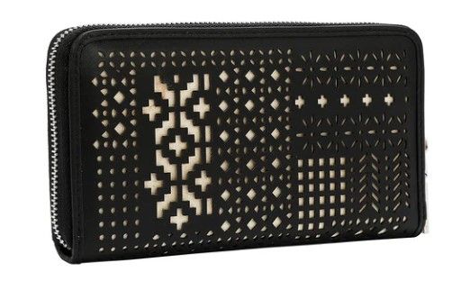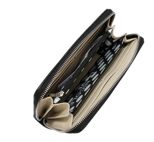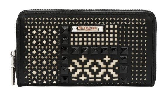 Еко кожа Основно отделение с цип Предна и задна част, декорирани с капси и лазерно изрязан дизайн Златисти обковни елементи (черните чанти се предлагат със сребристи обковни елементи) Гравирано лого и детайли с кристали Ексклузивна полиестерна подплата с камилски принт 8 отделения за карти, 2 отделения за банкноти Централно отделение с цип и отворено отделение Размери: 19,7 см (Д) × 3,8 см (Ш) × 10,8 см (В)