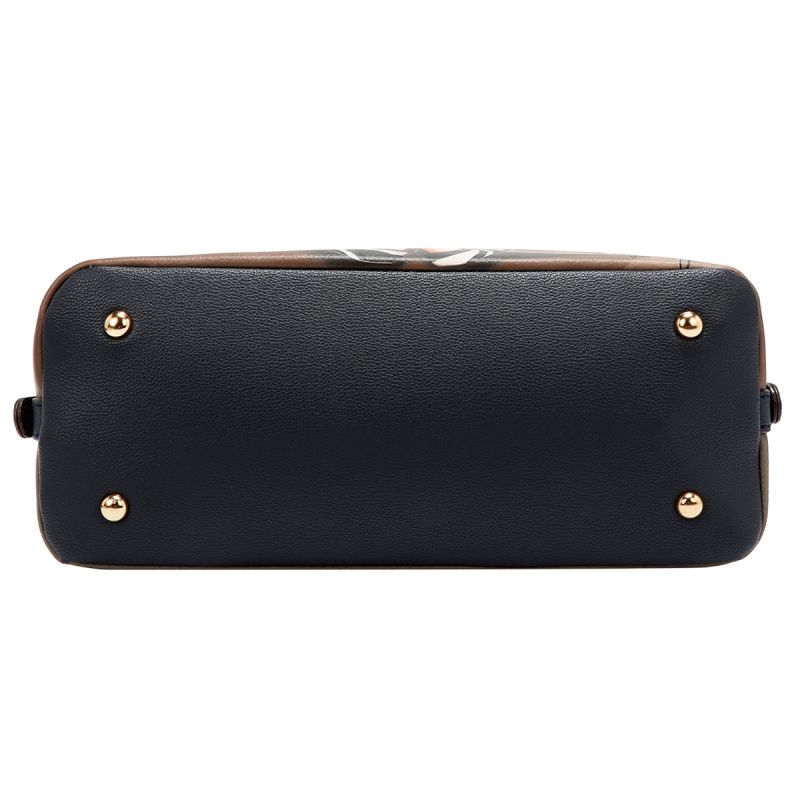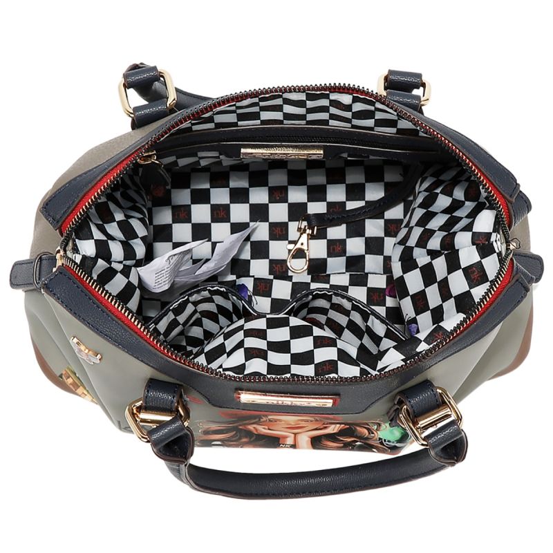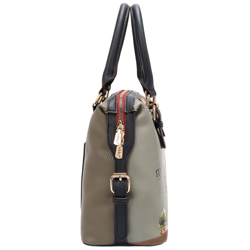 Детайли за продукта: Изработена от висококачествена еко-кожа с камъчета. Дръжки с еко-кожени дръжки с навален покрив. Основното закопчаване на ципа с гравирани Nikky ципове. Ексклузивен принт Nikky Signature отпред. Златиста табелка с логото на Ники отпред. Дизайн на детайли на колана отстрани. Задният джоб. Структуриран силует с плоска основа и метални крака. Голям интериор, подплатен с Nikky с печатен полиестерен плат. Два отворени джоба за аксесоари отпред. Един джоб с цип на стената отзад с еко-кожена закопчалка за ключодържатели. Регулируема и подвижна лентена каишка с логото на Nikky. Размер: 31x22.5x13cm