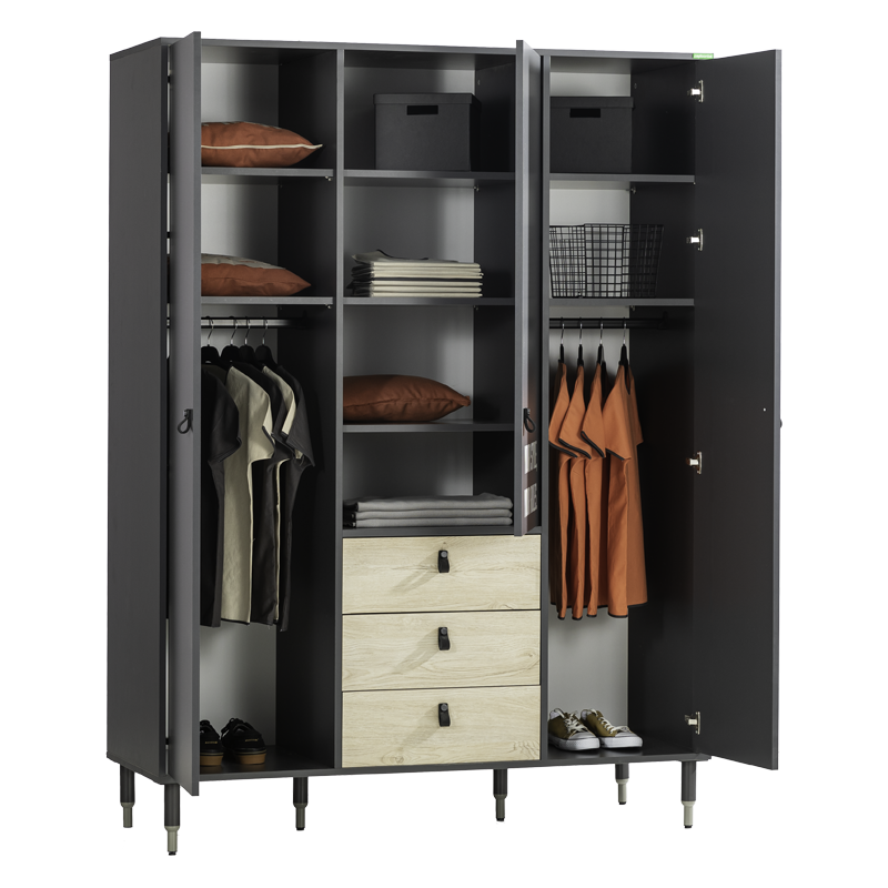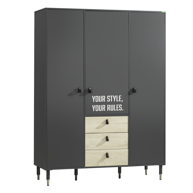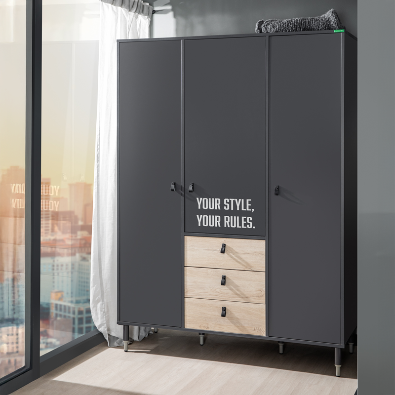 Трикрилен гардероб MOTTO не е просто място за съхранение на дрехи, а отражение на индивидуалния стил и характер. Моделът съчетава аристократичното излъчване на антрацит и дървесни повърхности с текстурата на кожени дръжки, предлагайки премиум изживяване. Дизайнът е допълнен от специален типографски UV печат върху вратите, който е устойчив на вода и избледняване. За максимално удобство и безопасност, гардеробът разполага със системи за плавно затваряне на вратите и чекмеджетата, както и високи метални крака, улесняващи почистването под него. Пълна информация за размерите и характеристиките на модела ще намерите в таб/поле "Техническа информация".