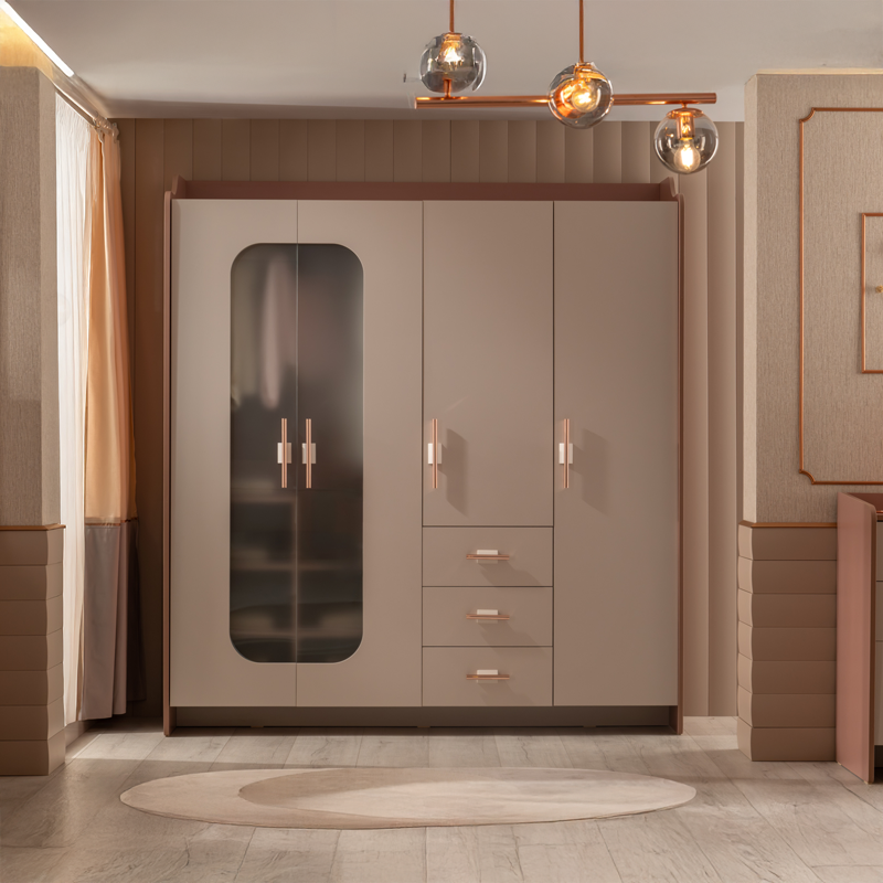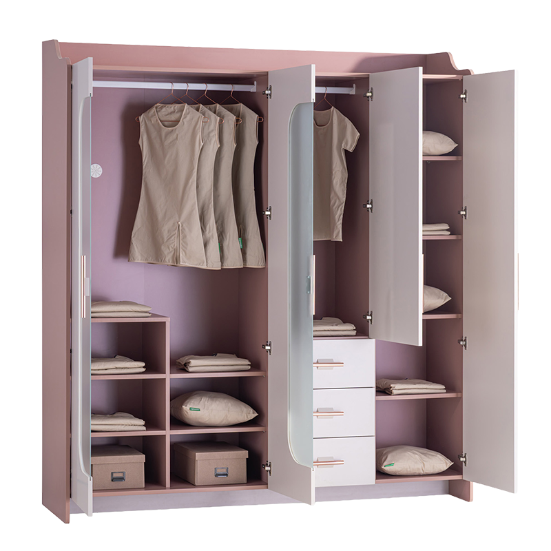 Четирикрилен гардероб ESTELLA съчетава изтънченост и функционалност в дизайн, който придава съвременна атмосфера на интериора. Моделът се отличава със стъклени врати и стилни акценти, които подчертават модерната му визия, подходяща както за младежки стаи, така и за спални. Вътрешното пространство е прецизно организирано, като включва вградено сензорно LED осветление и специална вентилационна система за постоянна свежест на дрехите. Използваните материали със сертификат E1 отговарят на високи стандарти за безопасност и устойчивост при ежедневна употреба. Пълна информация за размерите и характеристиките на модела ще намерите в таб/поле "Техническа информация".