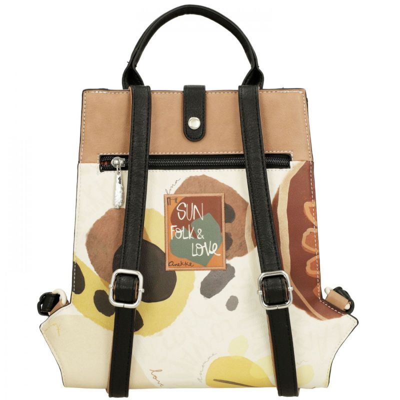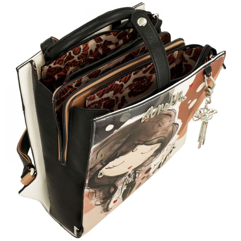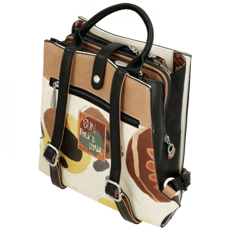 Квадратна раница с няколко самостоятелни отделения. Отваряне с цип. Оборудвана с джоб на гърба и три основни с цип,както и вътрешни за съхранение на ключове и телефон. Регулируеми презрамки и къса дръжка. Поставена подплата в интериора и удобни джобове. Размери: 25 см x 28 см x 8 см.