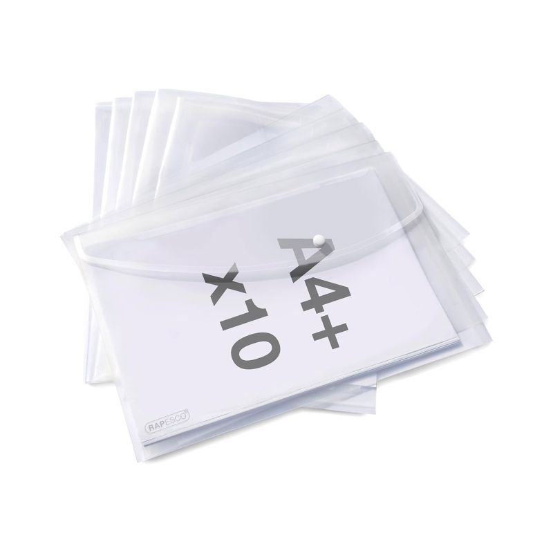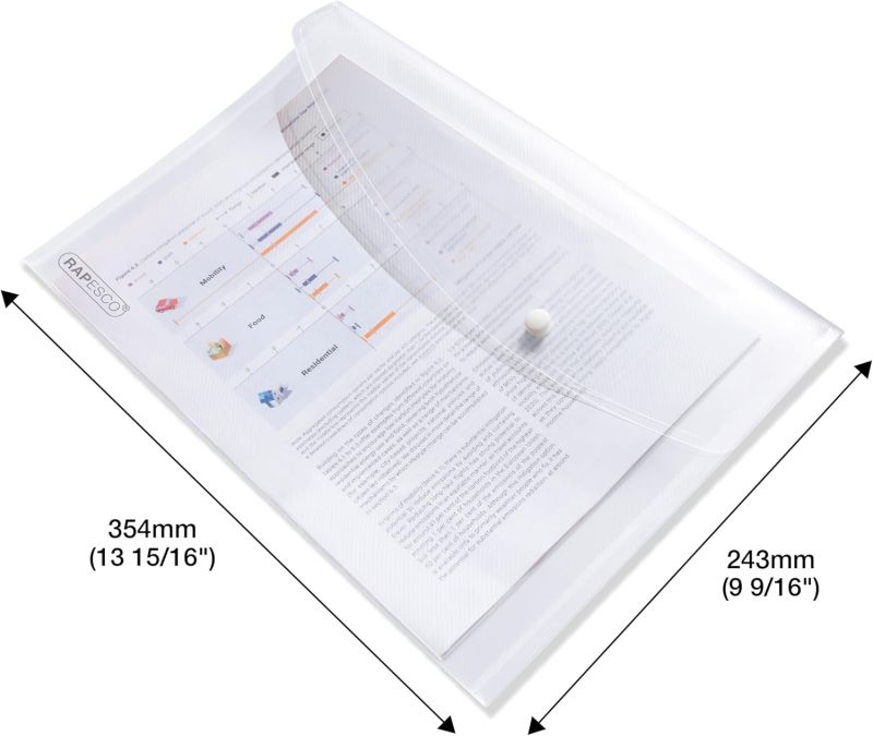 Изработени от 100% рециклиран полипропилен, тези папки са сертифицирани по GRS стандарт, като същевременно запазват високо качество и отличен външен вид. Както самите папки, така и тяхната опаковка са напълно рециклируеми, което ги прави отговорен избор за всеки офис или дом. Папките са изработени от здрав 200-микронов полипропилен със Superline покритие, което осигурява издръжливост и защита на съдържанието. Прозрачният дизайн позволява бързо разпознаване на документите, без да се налага отваряне, което улеснява организацията и спестява време. С капацитет до 150 листа (80 g/m2) във формат A4+, тези папки са подходящи за съхранение на по-голям обем документи. Сгъваемият капак с бяло копче осигурява сигурно затваряне, а практичният отвор за химикалка под капака добавя допълнително удобство. Размери на една папка: 354 (ширина) х 243 (височина) х 2–7 (дълбочина) mm.