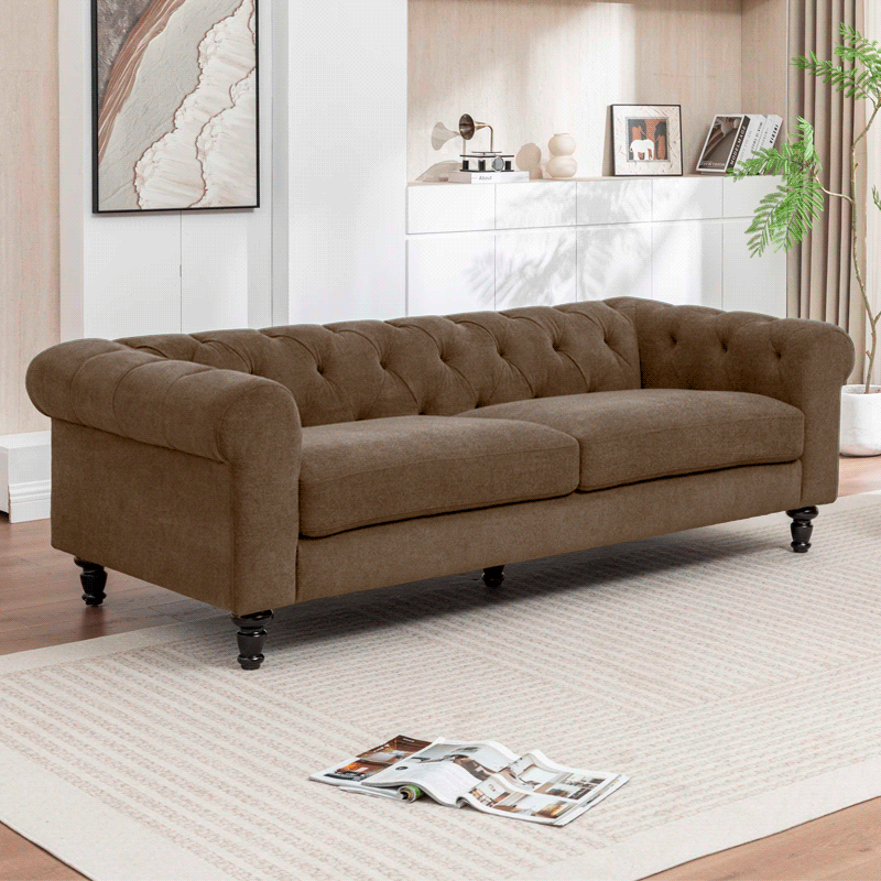 Диван тройка Chester е класическо и стилно решение, което внася лукс и елегантност във всеки интериор. Моделът е тапициран с мека и устойчива дамаска в топъл цвят, допълнена от характерните капитонирани детайли и заоблени подлакътници. Стабилността е гарантирана от здрава дървена конструкция, а комбинацията от пенополиуретан и покет пружини в пълнежа осигурява максимален комфорт при седене. Пълна информация за размерите и характеристиките на модела ще намерите в таб/поле "Техническа информация".