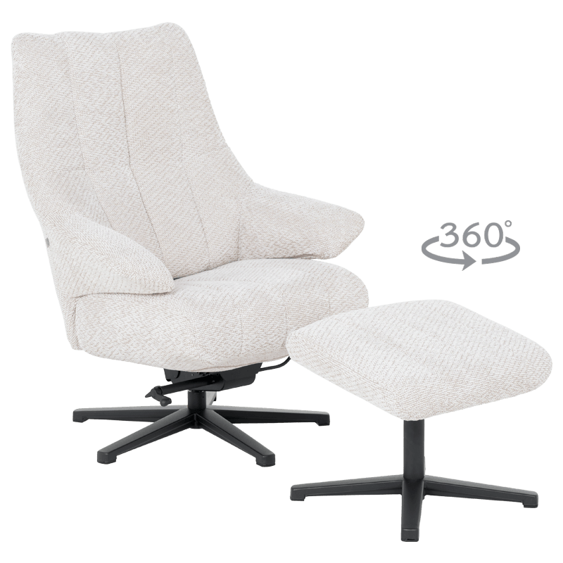 Кресло с табуретка ALFENA е проектирано да осигури оптимална релаксация чрез съчетание от съвременен дизайн и функционалност. Моделът разполага със седалка и облегалка, тапицирани с качествена дамаска, и стабилна основа с прахово боядисани крака. За максимално удобство са интегрирани функции за въртене на 360 градуса, люлеещ механизъм и възможност за заключване на облегалката в избрана позиция. Комплектът включва една табуретка, изпълнена в същия стил, която допринася за пълноценната почивка. Конструкцията е разчетена за максимално натоварване до 130 кг. Пълна информация за характеристиките на модела ще намерите в таб/поле „Техническа информация“.