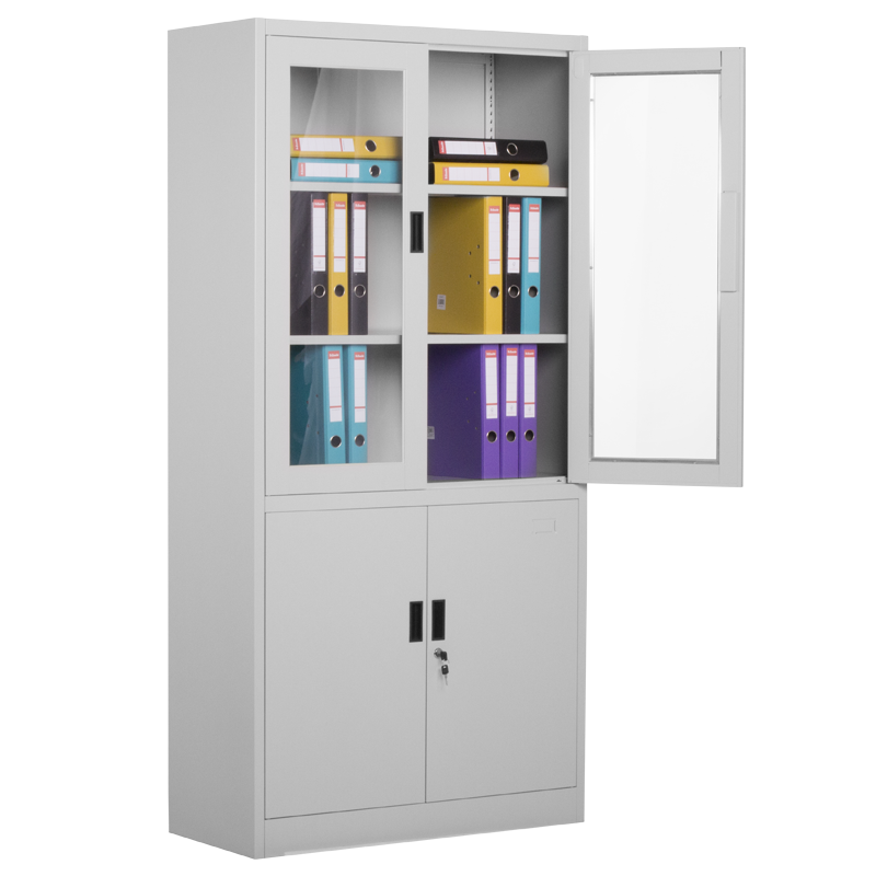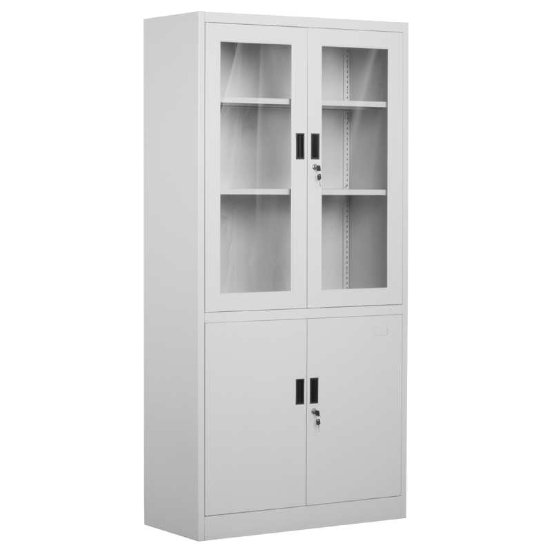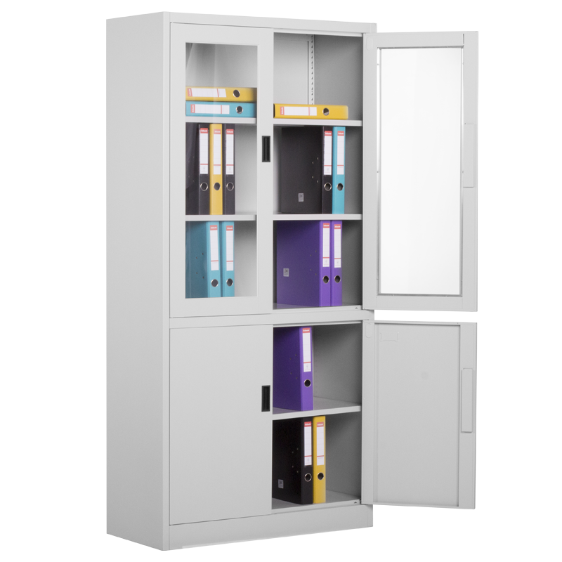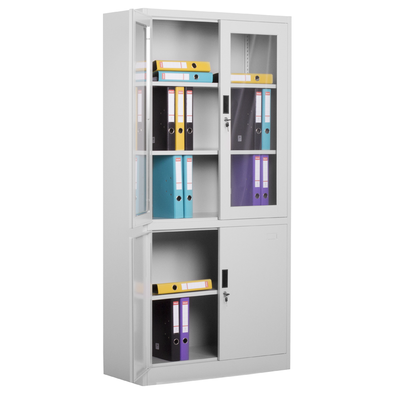 Металният шкаф CR-1272 J разполага с две отделения – долно с плътни врати и един рафт, и горно – с два рафта и врати с прозрачни стъкла. Всяко отделение е със самостоятелен заключващ механизъм и ключове. За по-голямо удобство, моделът позволява да регулирате височината на рафтовете. Пълна информация за размерите и характеристиките на модела ще намерите в таблицата в таб/поле "Техническа информация".