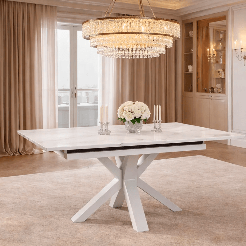 STARGARD е модерна трапезна маса с масивни и нестандартни крака, изработени от праховобоядисан метал. Тя e с правоъгълен керамичен плот с практична функция за разтягане. Пълна информация за размерите и характеристиките на модела ще намерите в таблицата в таб/поле "Техническа информация".