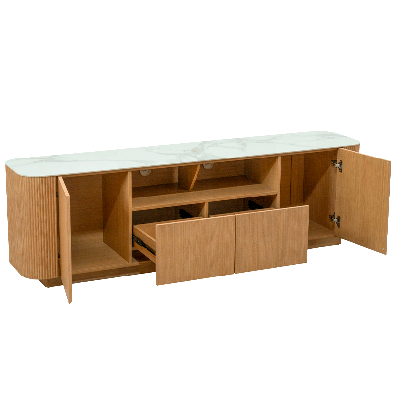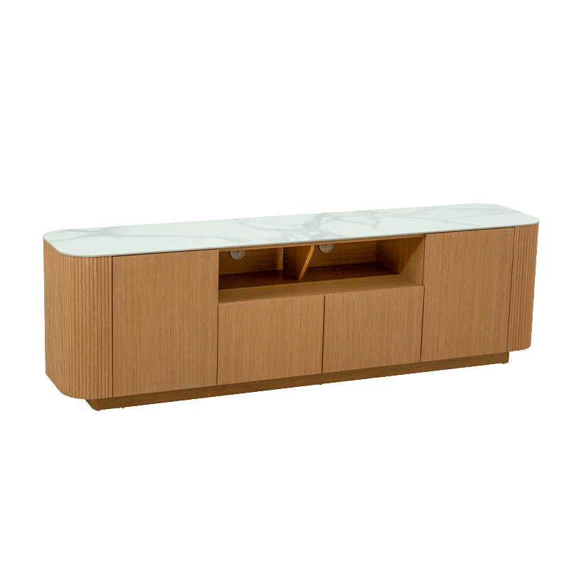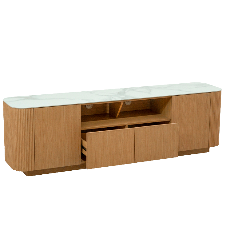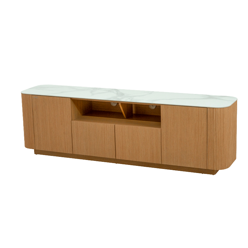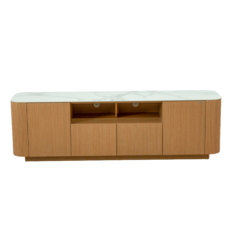 Тв шкаф Kolno съчетава модерна изтънченост и практичност, превръщайки се в перфектен център за Вашата мултимедийна зона. Плотът е изработен от висококачествена керамика с дебелина 6 мм, която осигурява устойчивост и луксозно излъчване. Корпусът и основата са изпълнени от МДФ с естествен фурнир, чиято текстура придава естествена топлина на дизайна. Моделът предлага функционално разпределение с 2 врати и 2 чекмеджета, предоставяйки достатъчно място за съхранение на техника и аксесоари. За Ваше максимално удобство тв шкафът се доставя сглобен в кашон, което елиминира нуждата от монтаж. Пълна информация за характеристиките на модела ще намерите в таб/поле „Техническа информация“.